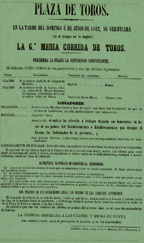 , atteste aussi d'une course le dimanche 8 juin de la même année 1862 : la 6e "media corrida". Sont annocés 8 toros : 4 de la viuda de Joaquín MAZPULE et 4 de la Viuda de LARRAZ e Hijos, toujours présentés comme antes de Miguel MARTÍNEZ de AZPILLAGA et frères [de sang] des toros de la viuda de [Juan] Miura. Picadors : Antonio ARCE, Mariano CORTÉS et José MARQUETI, plus 3 de réserve. Espadas : Cayetano SANZ, Antonio GIL (qui offre ses honoraires pour les pauvres) et José Antonio SUÁREZ ; sobresaliente, Pablo HERRÁIZ. Cette répétition de l'élevage dans la capitale plaide pour lma qualité de la ganadería.