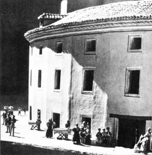 ° Le dimanche 16 août 1874, cest la dernière corrida aux arènes de la porte dAlcalá. Le vendredi 4 septembre verra linauguration des nouvelles arènes de la route dAragon (là où se trouve lactuel Palais des Sports) ; mais il faut attendre la 6e course, celle du dimanche 27 septembre 1874 -qui est aussi la 19e de labonnement-, pour voir dans ces nouvelles arènes les toros de Dolores MONJE, viuda de MURUVE (sic !) ; ils sont lidiés en 2º, 4º et 6º position, prennent 21 piques et tuent 5 chevaux ; ils sortent avec de la présence, vifs dans les leurres ; les 4e et 6e ont beaucoup de force (poder) et le 2e , estoqué par "FRASCUELO", est un manso méfiant. Les 3 autres, dAnastasio MARTÍN, prennent 22 piques et laissent 6 chevaux morts. Espadas : Rafael MOLINA "LAGARTIJO"