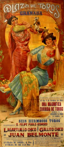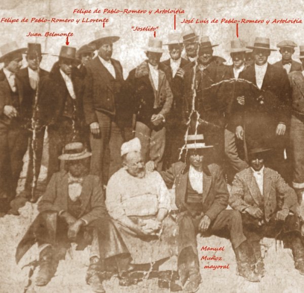 à PARTIDO DE RESINA en 1917 : on peut y voir, de gauche à droite, Juan BELMONTE, le ganadero, "JOSELITO" (il portait donc des lunettes ?!...) et les futurs ganaderos Felipe et José Luis de PABLO-ROMERO y ARTOLOITIA ; cette présence est révélétrice : avec ces 2 "monstres" de José et Juan, la tauromachie est en train de changer, et les ganaderos cherchent à adapter le comportement de leurs toros en conséquence : avec prudence et sans les dénaturer, le second Felipe emboîte le pas. Voici encore cette affiche d'une corrida à Granada en 1918