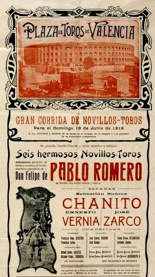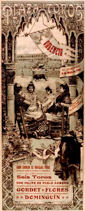 , bien que GORDET, FLORES, et DOMINGUÍN ne fassent paa partie des très grandes figures. Cela ne l'empêche pas de donner quelques novilladas, possiblement prestigieuses comme en témoigne cette affiche d'une novillada à Valencia en 1916