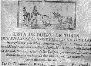 en possession de Juan Pedro DOMECQ SOLÍS [cf. son livre de 2009 : DEL TOREO A LA BRAVURA, p.22], indique encore qu'un toro de "D. Thomas de RIVAS" doit être couru à la Maestranza de Sevilla le 30 avril ou le 2 mai 1763, avec une devise rouge (encarnada).