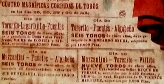 ° Le vendredi 30 juillet 1897 : 9 toros, dont 3 de l'Excellentissime DUC de VERAGUA, achetés 5.250 pesetas, et 6 des Héritiers de Don VICENTE MARTÍNEZ, achetés 9.000 pesetas, pour MAZZANTINI, "TORERITO" et "VILLITA".