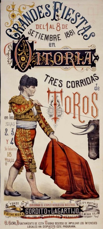 , VERAGUA voisinait aussi avec MIURA et Vicente MARTÍNEZ pour les 3 corridas des fêtes de Vitoria, torées par "GORDITO" et "LAGARTIJO". Autres temps, autres moeurs, l'affiche porte la mention : "L'excellentissime municipalité de cette ville, désireuse de servir les intérêts locaux, a prévu ce programme (lequel comprend aussi diverses fêtrs populaires) ; aujourd'hui, ça fait un peu rêver !.